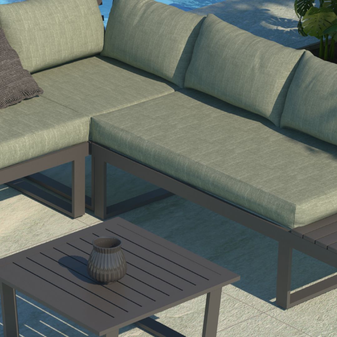 SOFIA DETALLE Publicado en 1080 &veces; 1080 en SOFIA DETALLE Conjunto jardín SOFIA: 2 sofás y 1 sillón esquinero más mesa de centro. Diseño elegante en aluminio gris antracita con cojines verdes. ← Anterior Siguiente →